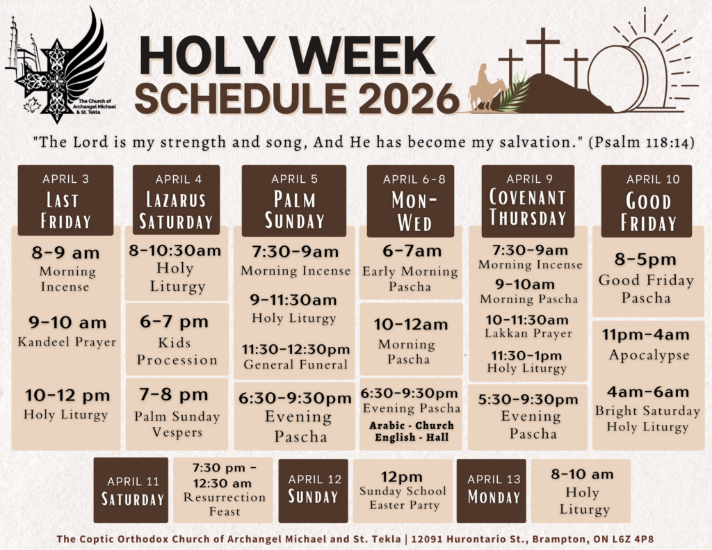The Church of Archangel Michael and St. Tekla wishes you a blessed and grace-filled Holy Week. Below is our Holy Week schedule, we invite you to join us as we journey together through the Passion and Resurrection of our Lord