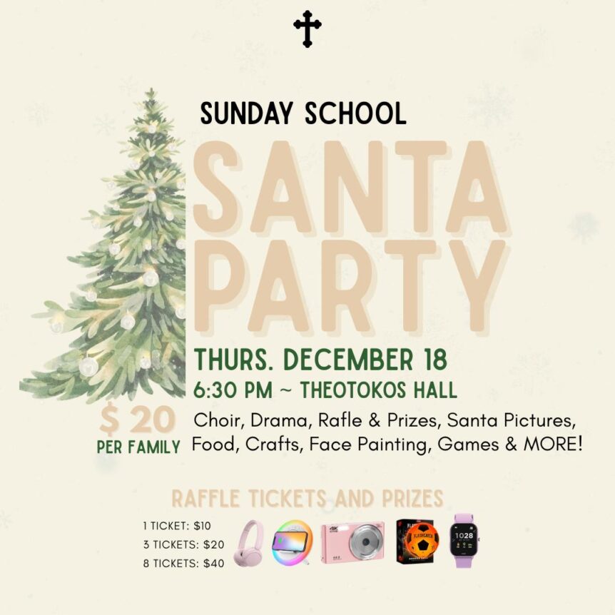 Join us on Thursday December 18 for our annual Sunday School Santa Party. There will be choir, drama, raffle & prizes, Santa pictures, food, crafts, face painting, games, and more! The cost is $20 per family. 1 raffle ticket is $10, 3 tickets is $20, and 8 tickets is $40.